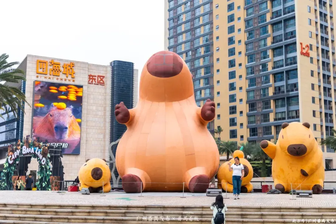 番禺四海城是拍照打卡的天堂!这里有独特的灯光装饰,如蛇年灯画,还有情绪稳定的卡皮巴拉,来这里随便一拍,能秒出大片!