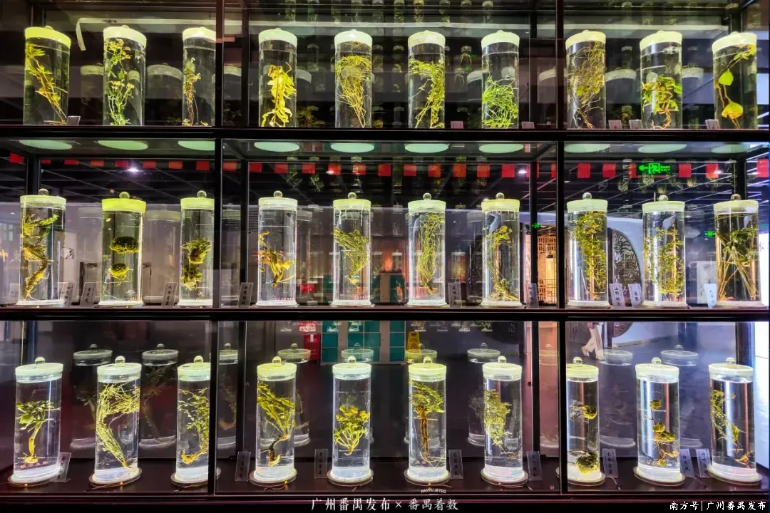 中药水晶宫令人眼前一亮,贯通三层的岭南中草药液浸标本墙,600瓶药用植物原色浸制标本晶莹通透,仰拍穹顶星芒,俯身“触碰”药草,科技感与自然美一键定格!